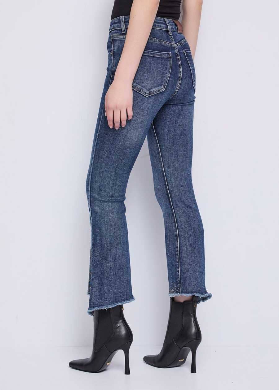 Tejido exterior: 94% algodón, 4% poliéster, 2% elastano Aberturas con pedrería y mini tachuelas en el bajo Cintura alta Pierna acampanada Largo crop Cinco bolsillos Bajo deshilachado Parche del logo Cierre con botones y cremallera oculta