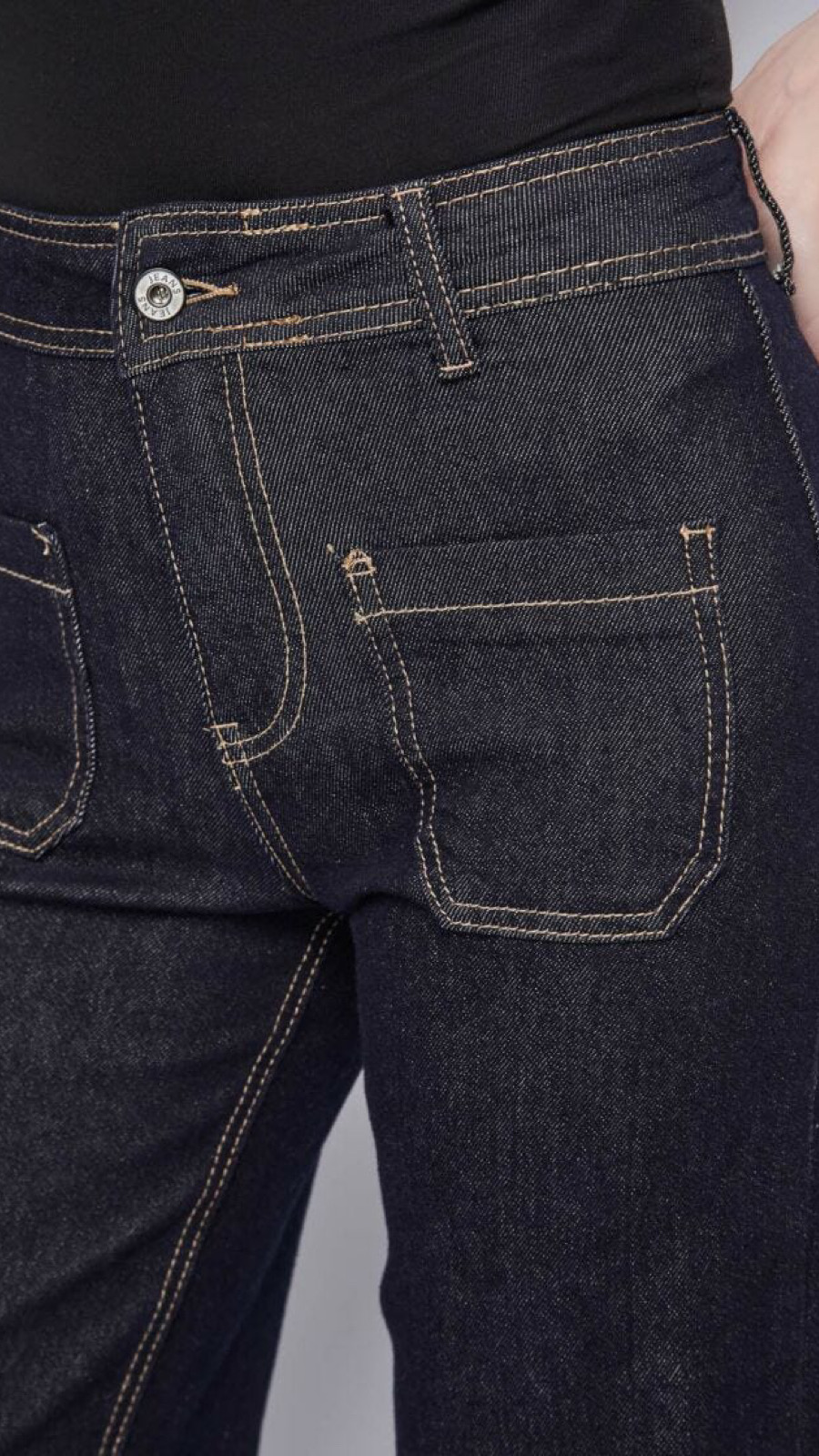 Tejido exterior: 94% algodón, 4% poliéster, 2% elastano Vaqueros de mezcla de algodón elástico Lavado usado Cintura alta Pierna acampanada Bolsillos delanteros con botones Bolsillos traseros Parche del logo