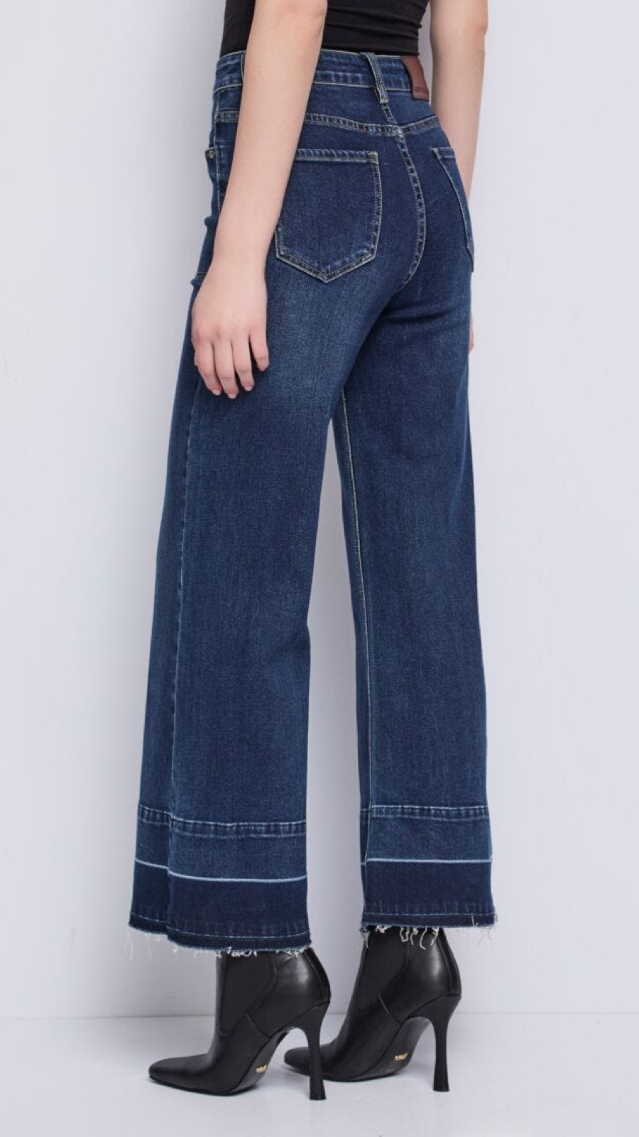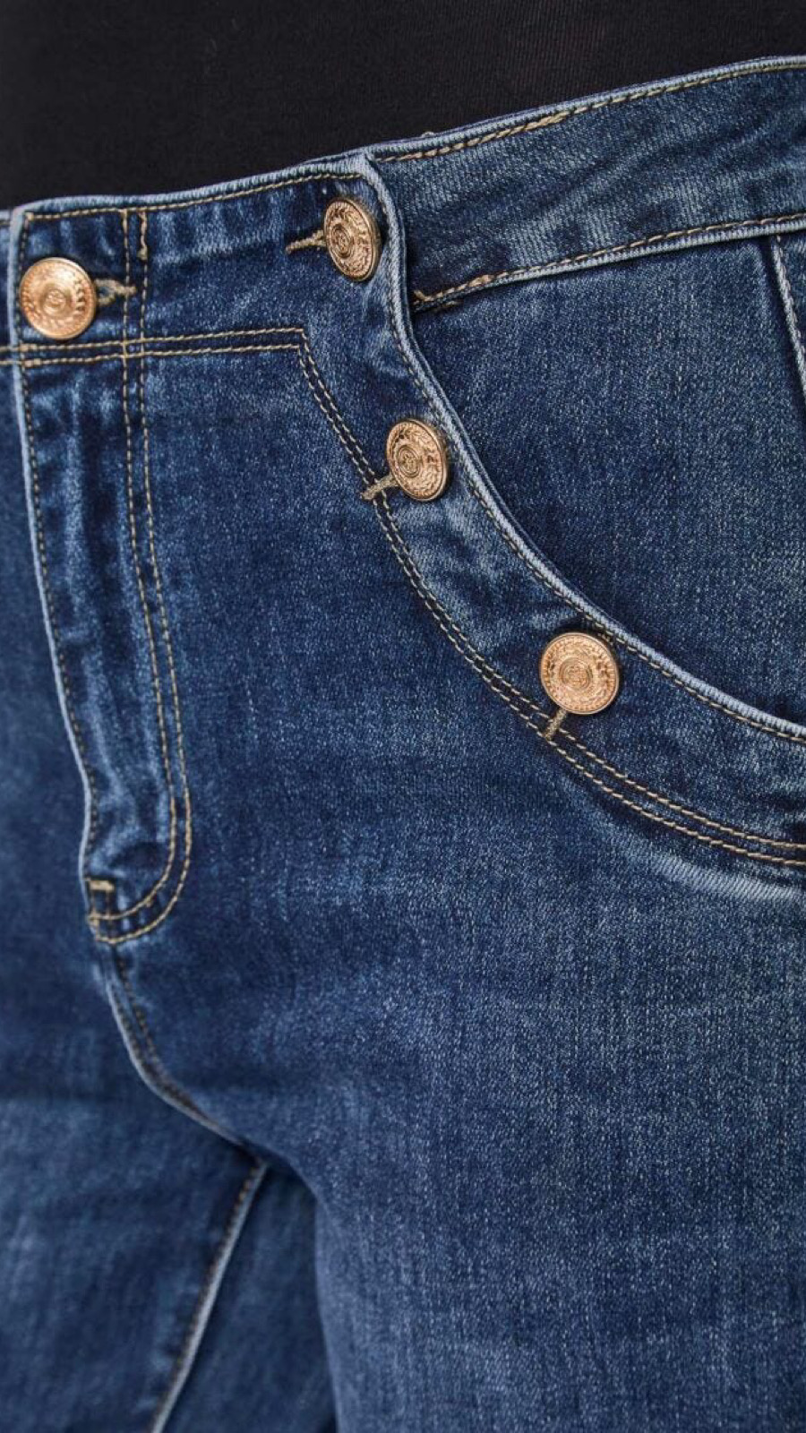 Tejido exterior: 95% algodón, 3% poliéster, 2% elastano Vaqueros de mezcla de algodón elástico Lavado usado Cintura alta Pierna recta Largo crop Bolsillos laterales con botones decorativos Bolsillos traseros Parche del logo Cierre con botones y cremallera oculta
