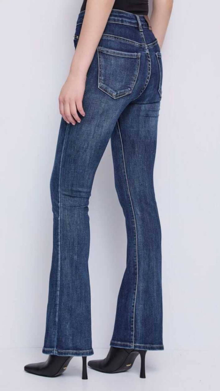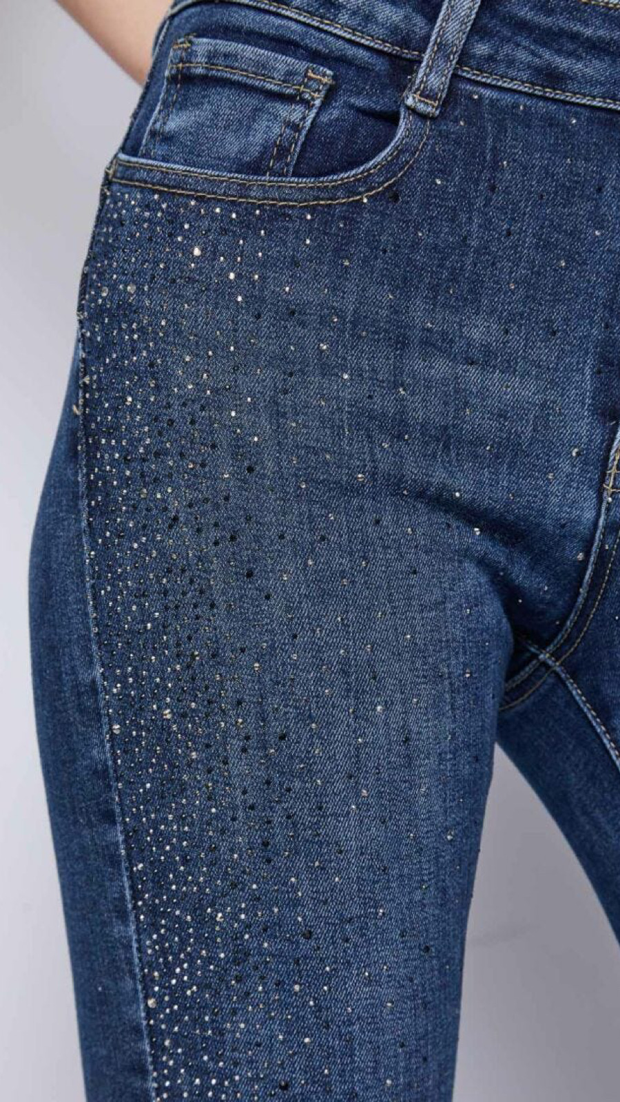 Tejido exterior: 94% algodón, 4% poliéster, 2% elastano Vaqueros de mezcla de algodón elástico Lavado usado Detalles de tachuelas Pierna acampanada Estilo de cinco bolsillos Parche del logo Cierre con botones y cremallera oculta
