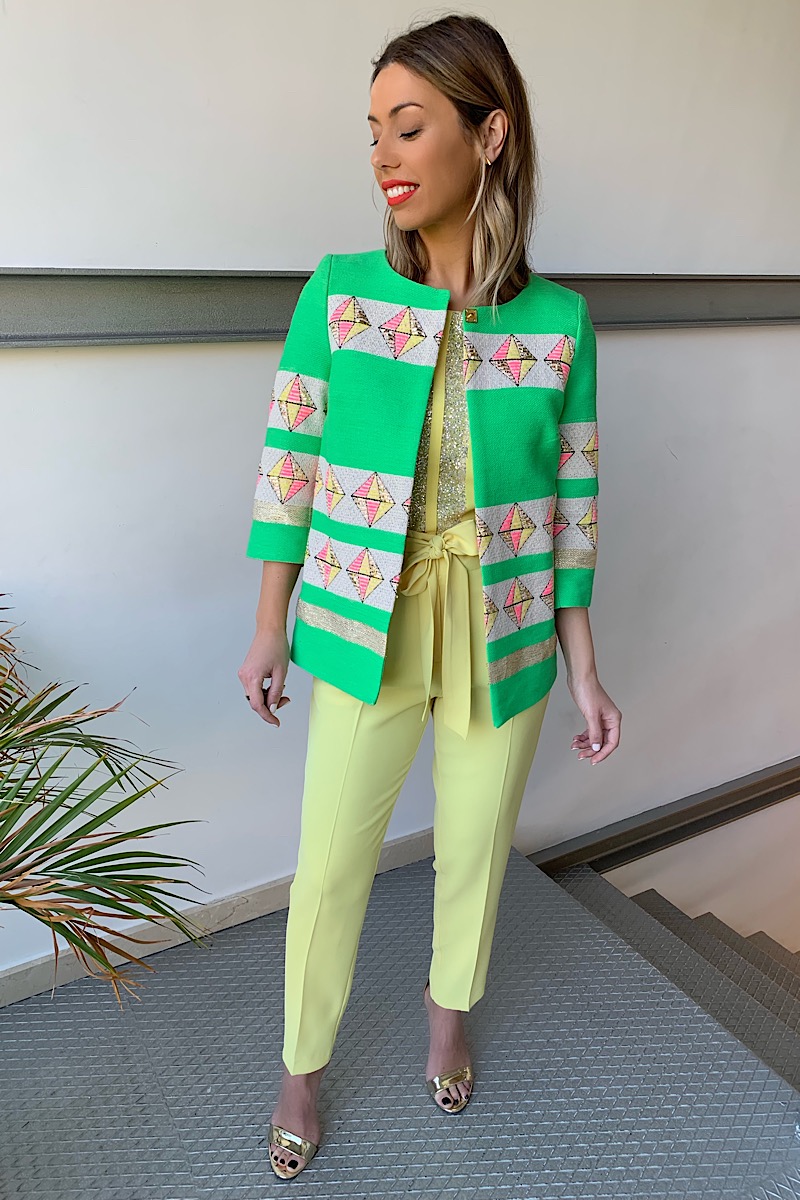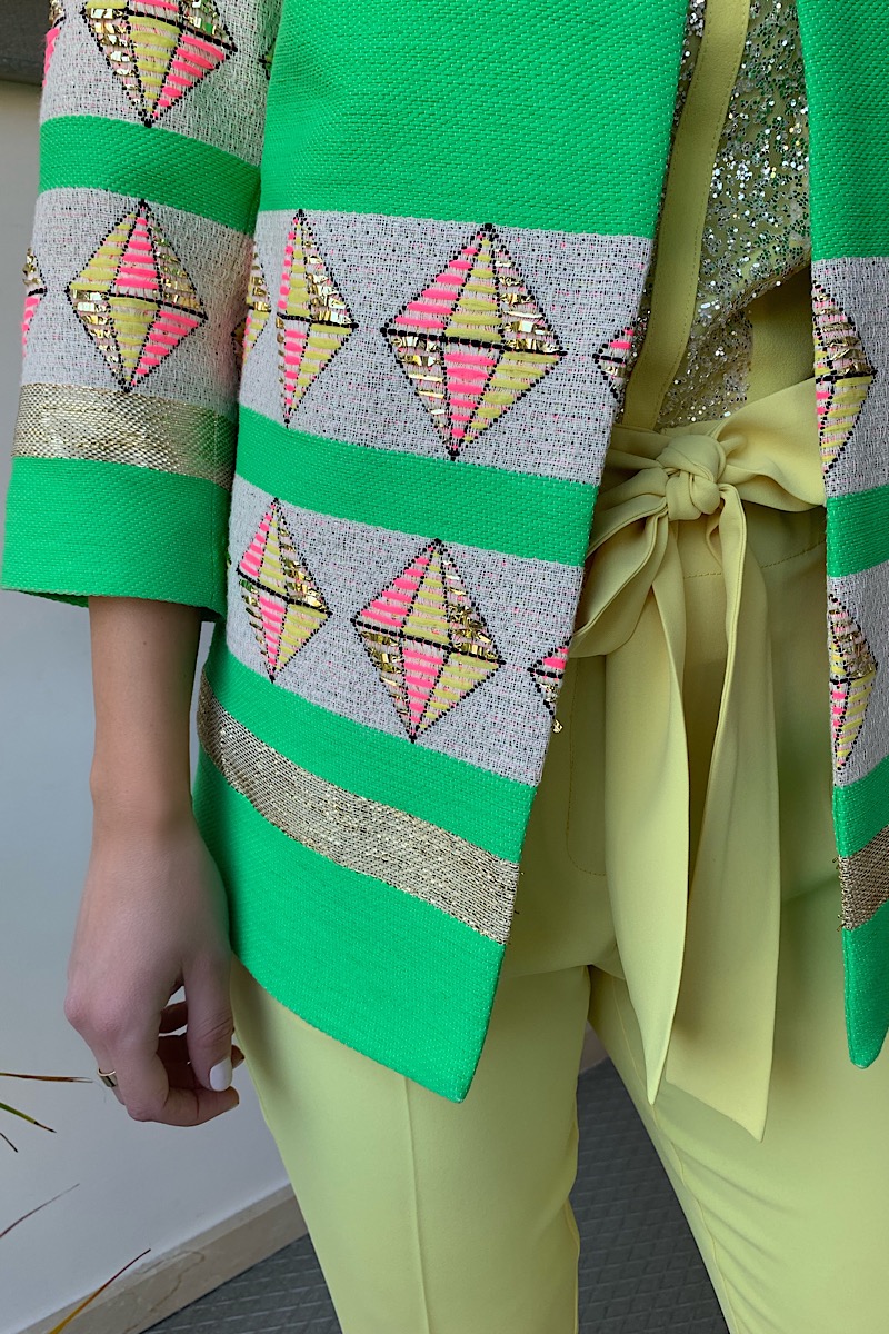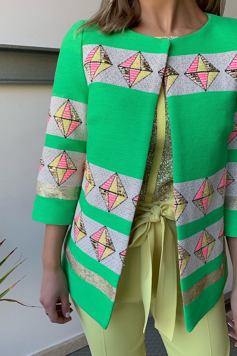 Chaqueta luxury con detalles joya en colores flúor y diseño de manga francesa.