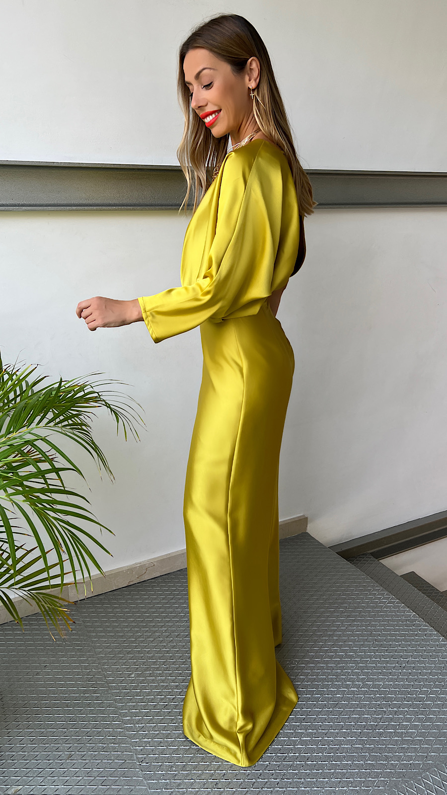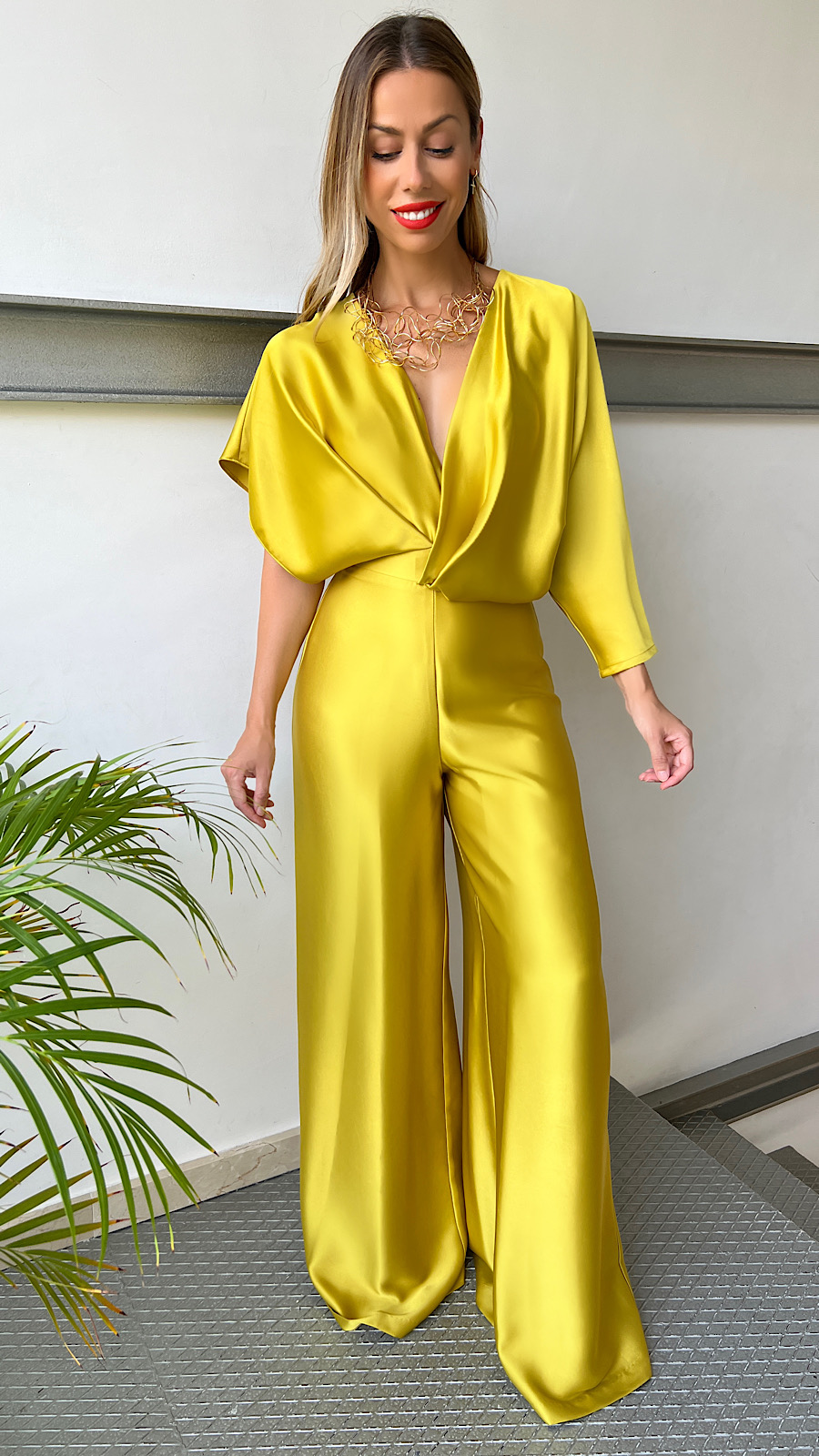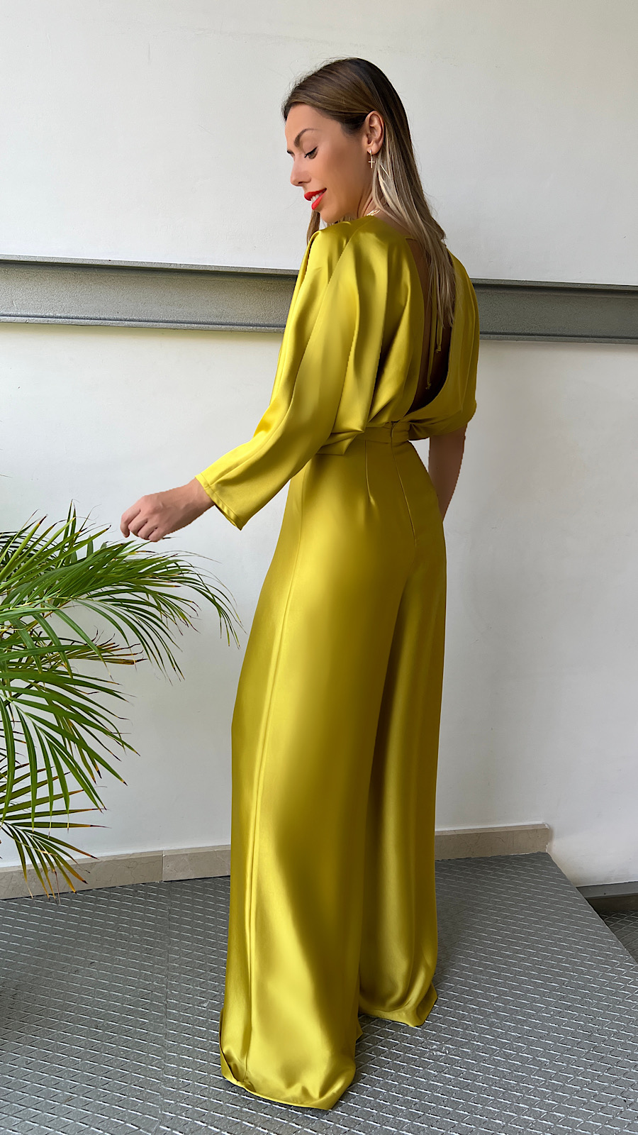 Mono Mostaza Manga Asimétrica Escote Espalda