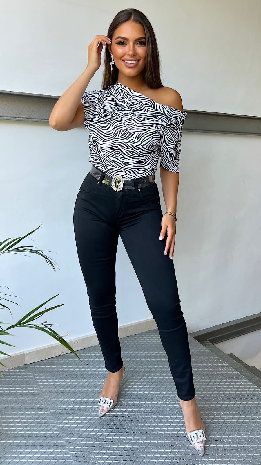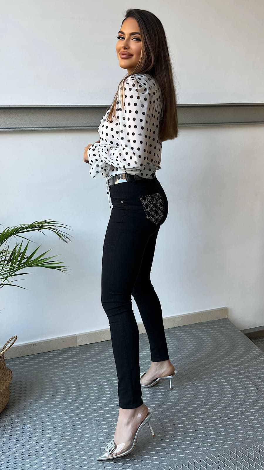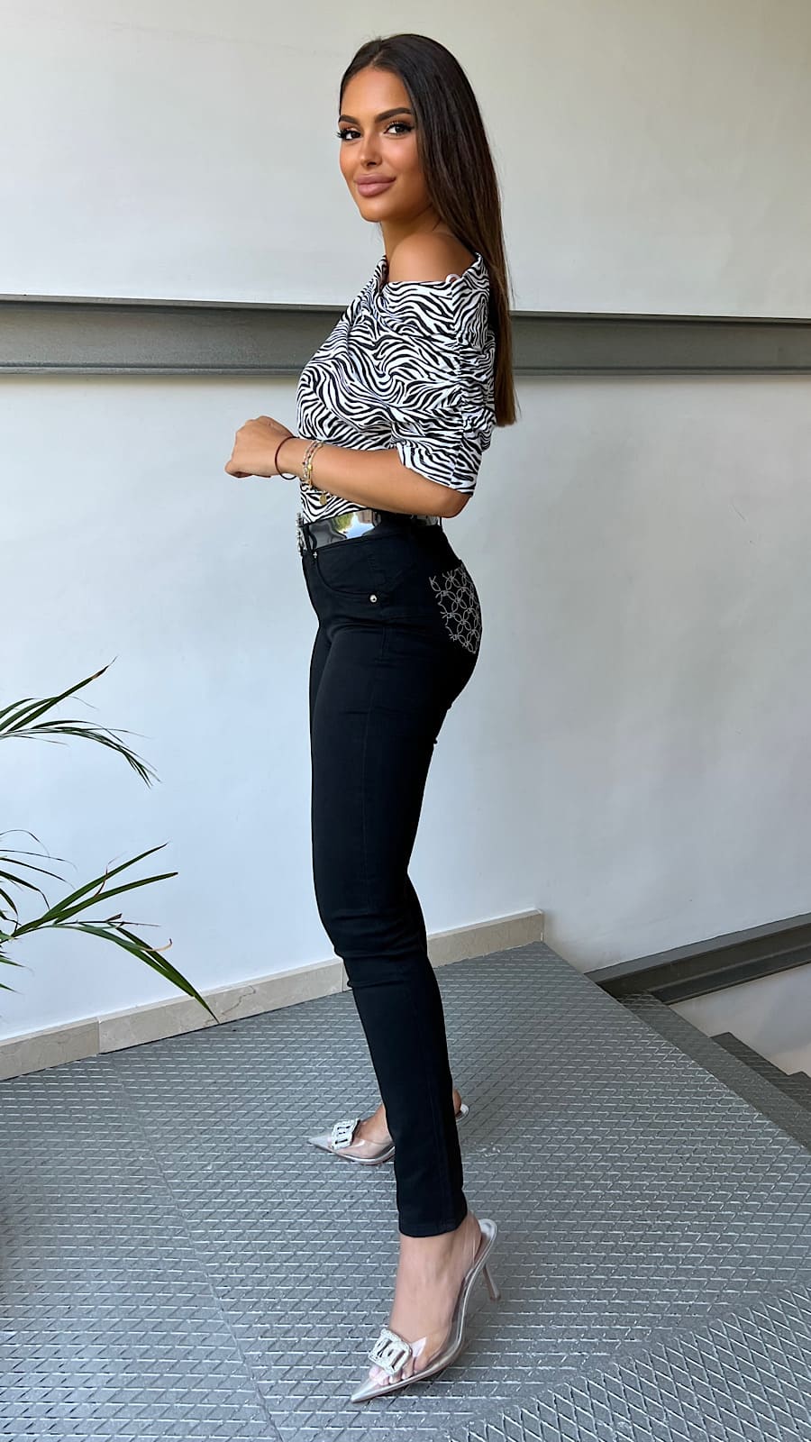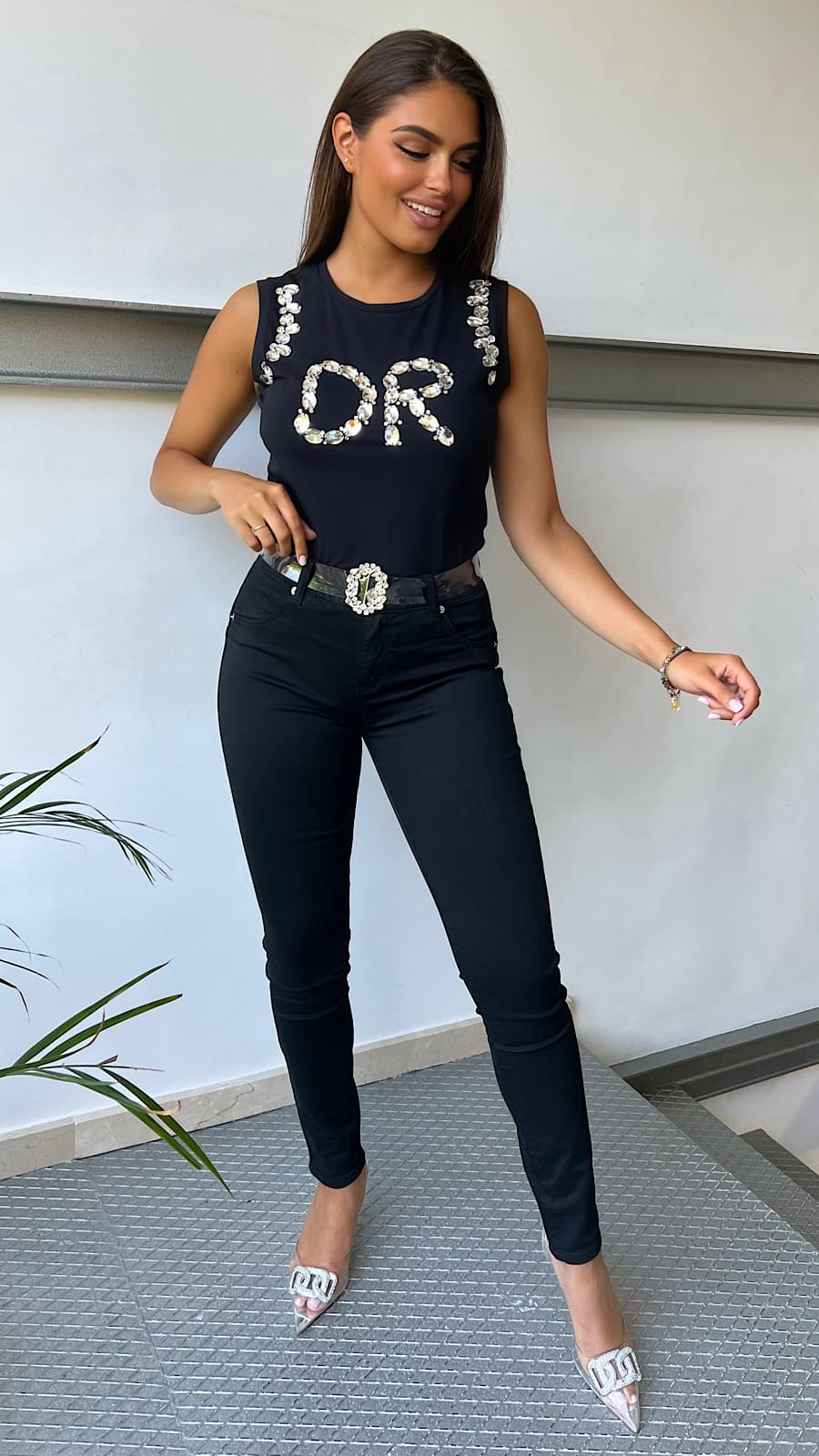 Pantalón vaquero negro de cintura media alta y corte súper skinny con diseño de rotos a la altura de la rodilla. Composición: 98%Algodón 2%Algodón