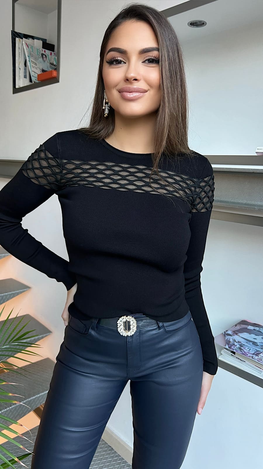 Pantalón vaquero negro de cintura media alta y corte súper skinny con diseño de rotos a la altura de la rodilla. Composición: 98%Algodón 2%Algodón