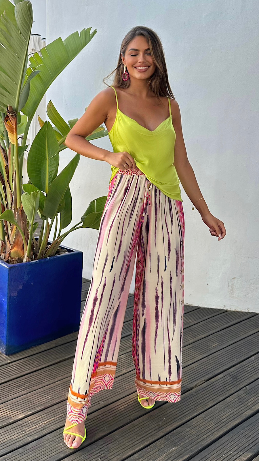 Top satinado en color lima, talla única que llega desde la 34 a la 38.