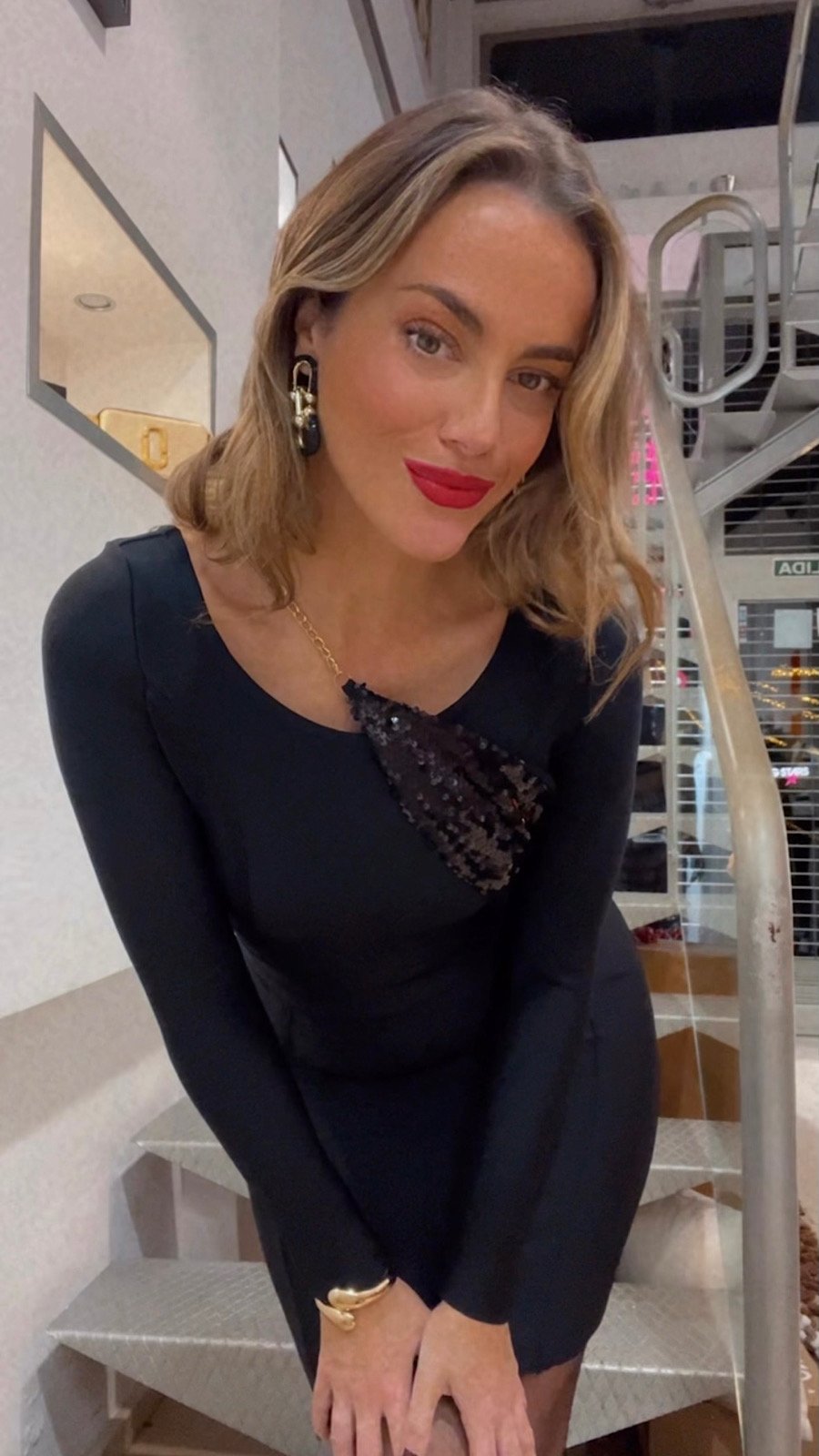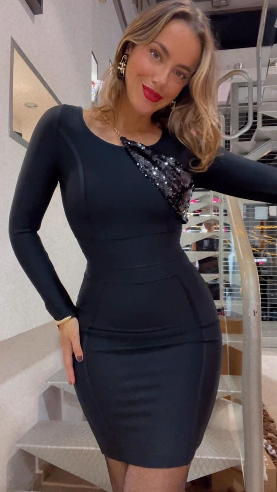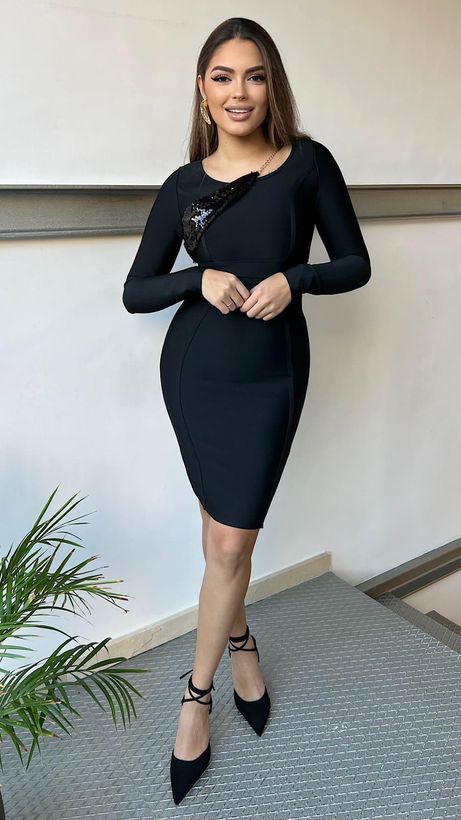 Vestido negro con diseño de manga tipo red que se puede poner o quitar. Tu decides, si quieres un vestido de manga larga o desmangado 😉