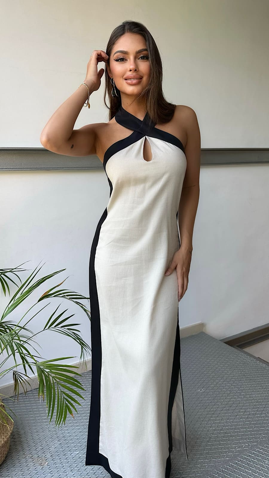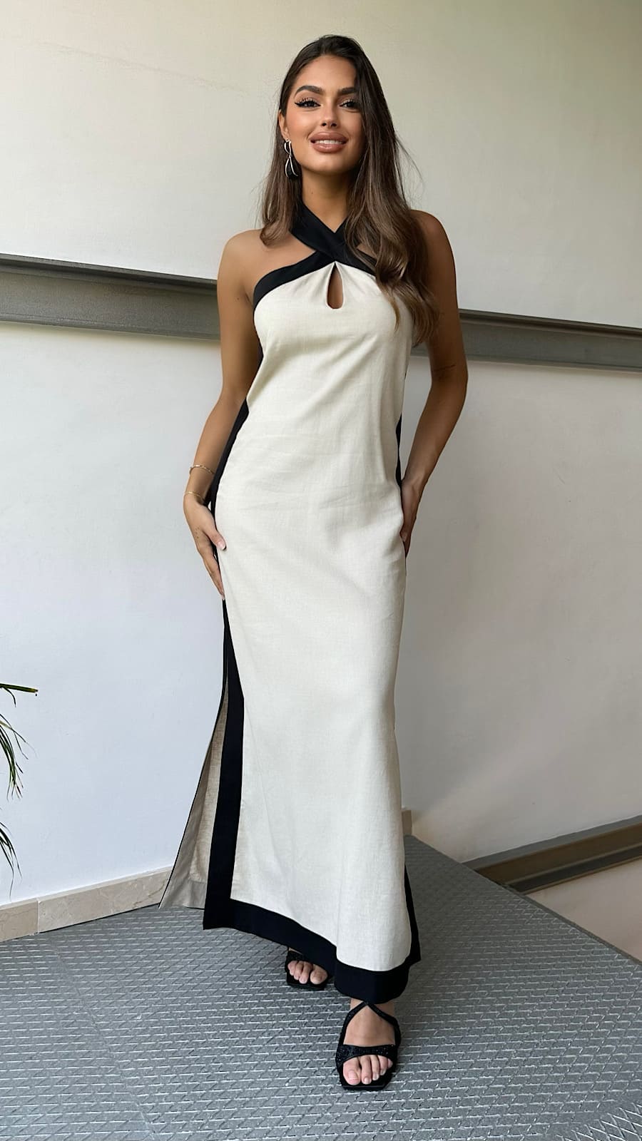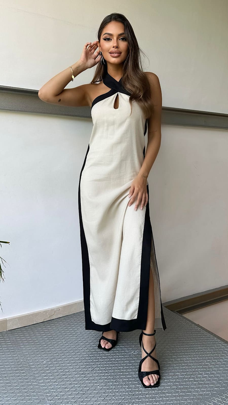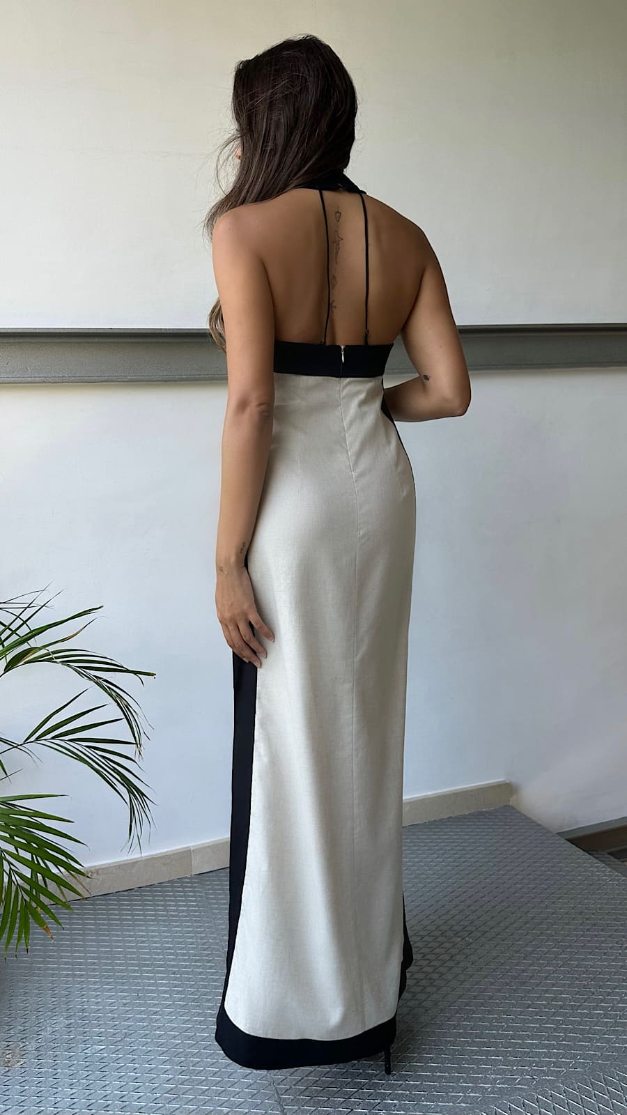 Vestido de largo midi en color bicolor asimétrico, mitad negro – mitad plata con manga francesa y escote corazón. Realizado en crepé y lamé elástico.