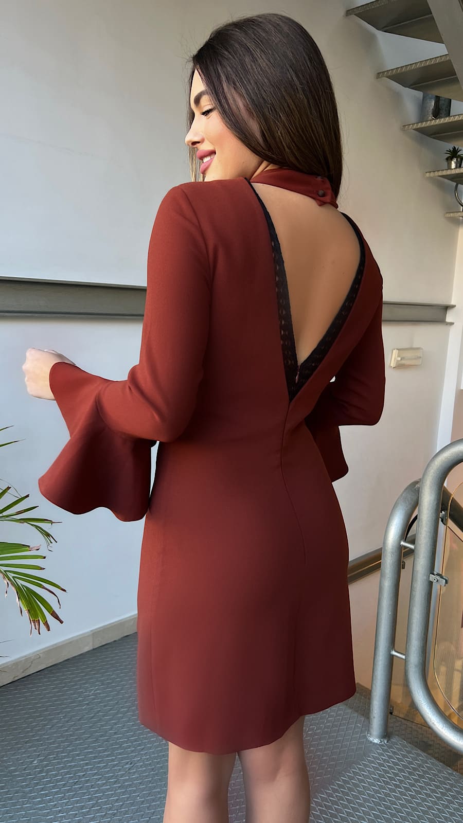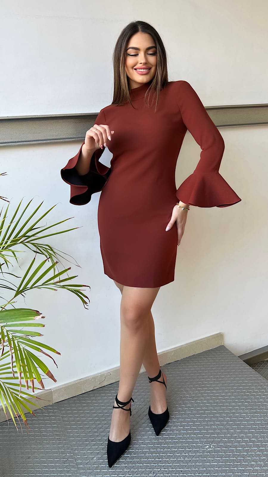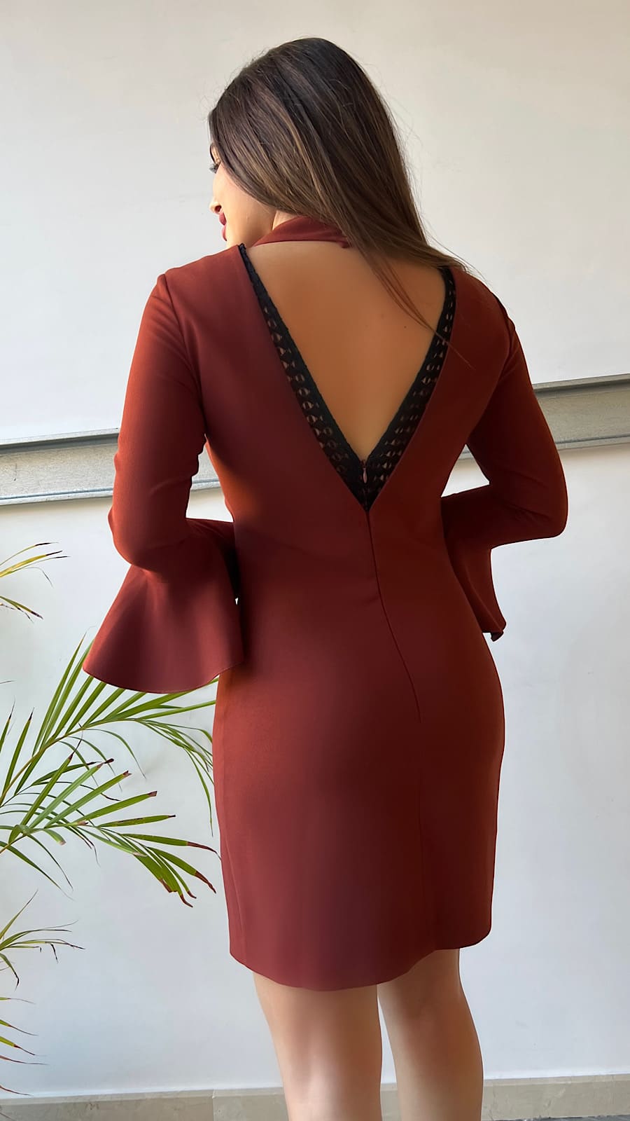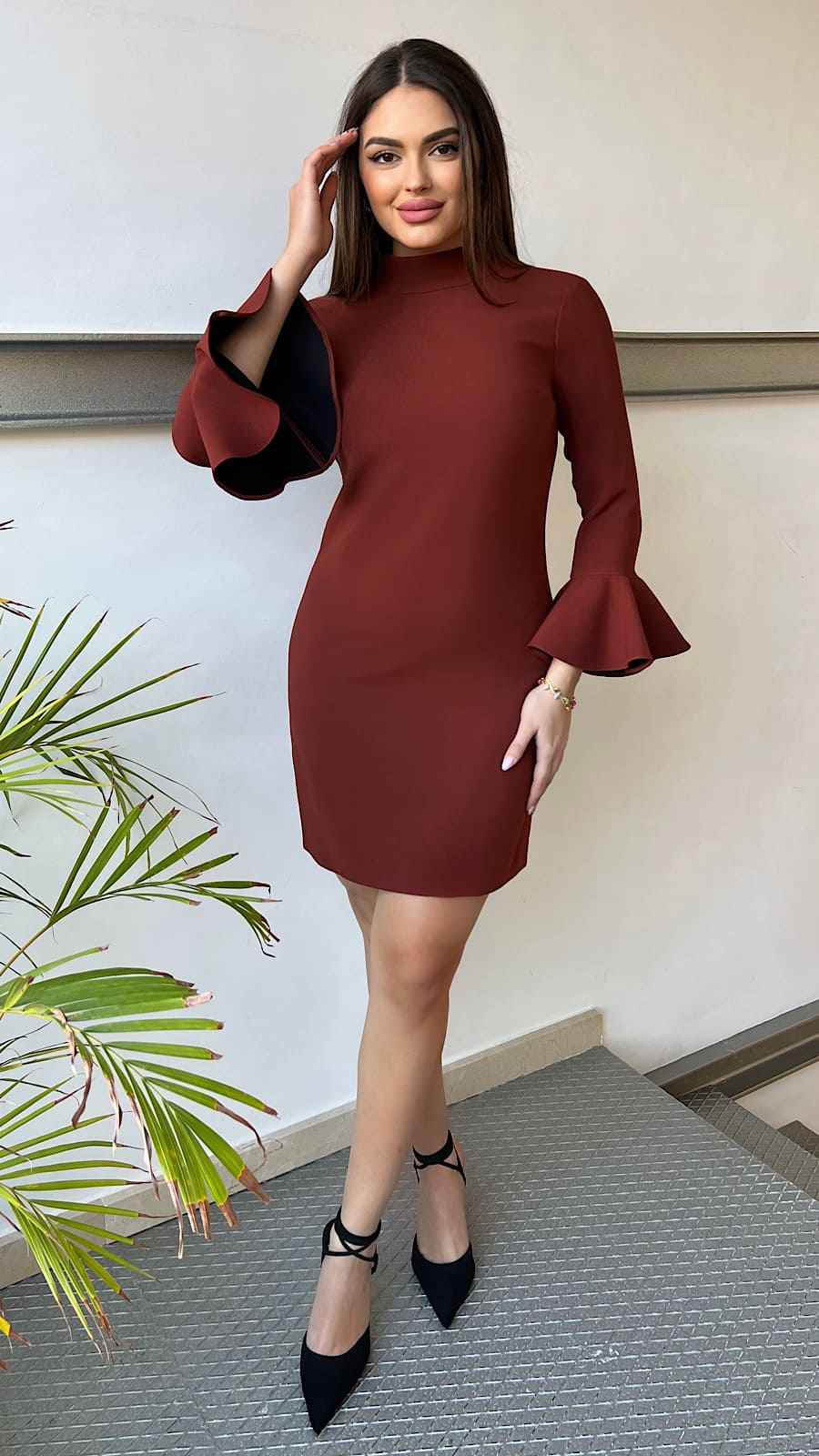 Vestido de color teja y corte ochentero y diseño de mangas con terminación capa.