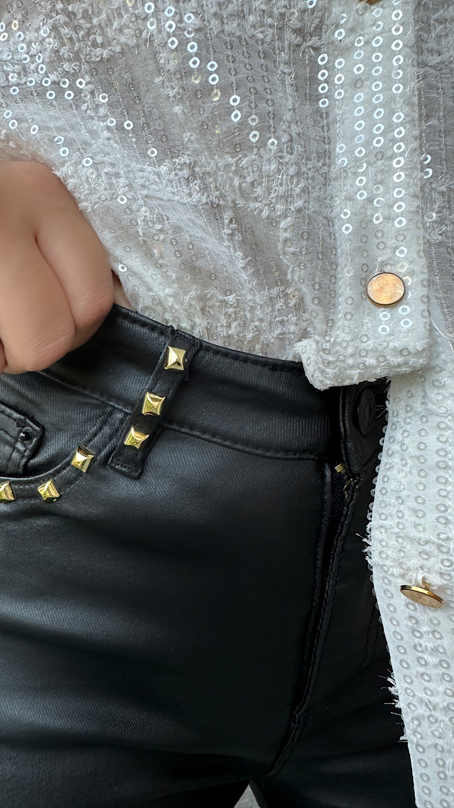 Tejido exterior: 75% viscosa (Lurex), 22% poliamida, 3% elastano Vaqueros ajustados push-up de mezcla de viscosa elástica Efecto piel sintética Diseño de cinco bolsillos Parche del logo Cierre con botones y cremallera oculta